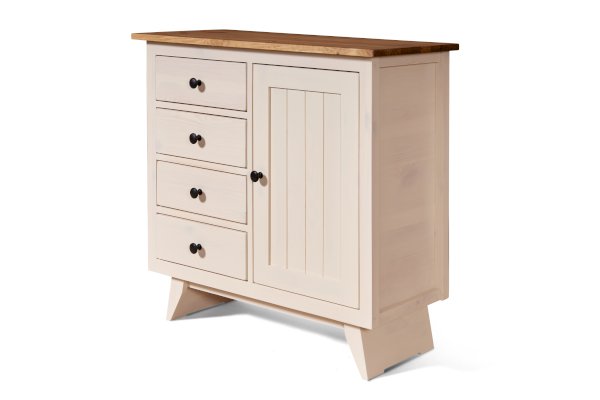 Комод Кимберли выделяется своим необычным дизайном, а именно черным фасадом верхнего ящика и стильными эргономичными ручками. Корпус модели выполнен в цвете светлого ясеня, а фасады оставшихся трех ящиков отделаны белым глянцем. Размеры комода позволяют разместить все необходимые вещи.
