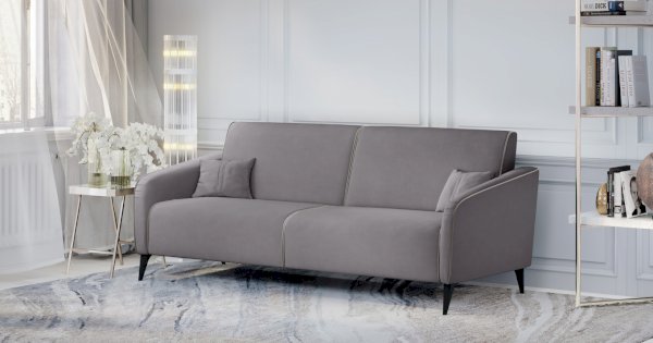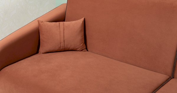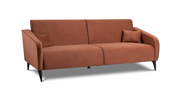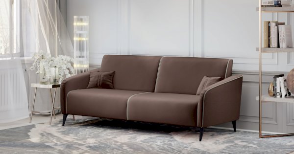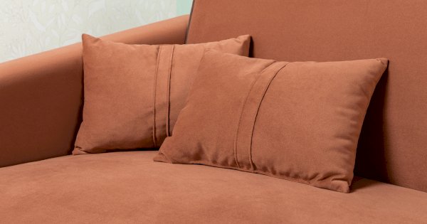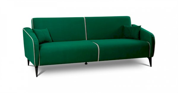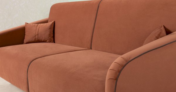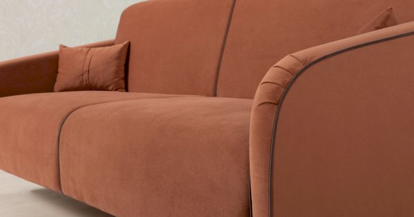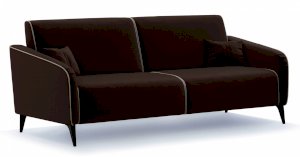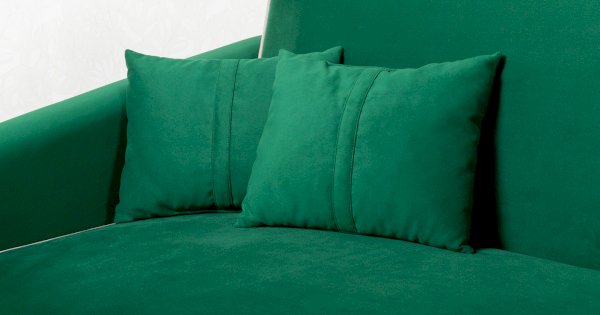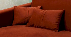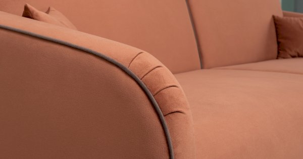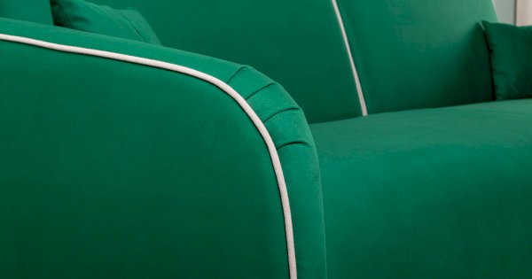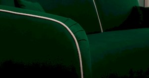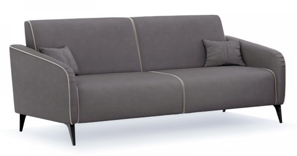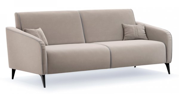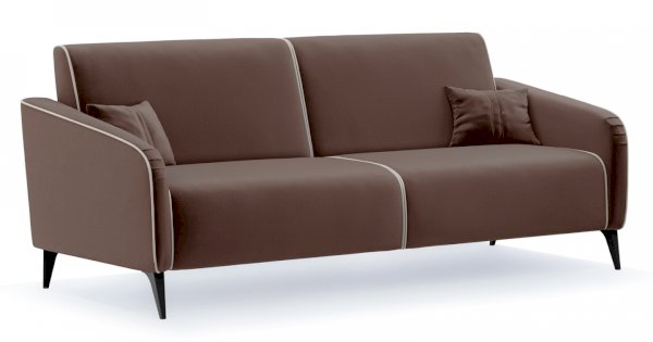 Контрастный кант на сиденье и подлокотниках, выраженные защипы на скругленных торцах подлокотников, декоративные подушки с двойной отстрочкой.