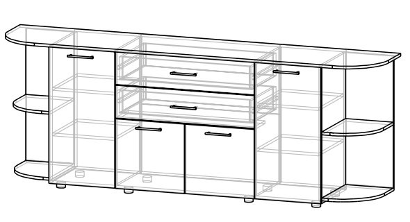 Комод из коллекции системной мебели Валенсия. Эта мебель отличается элегантным стилем и позволяет создавать классические предметы интерьера для гостиной, столовой, спальни или офиса. У модели четыре распашные дверцы с внутренними полками, радиусные полки с двух сторон и два практичных ящика.
