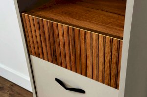Особенностью стеллажа "Доминика" является выкатной ящик, который обеспечивает дополнительное пространство для хранения. Фасад ящика украшен декоративным элементом в цвете "дуб крафт золотой", придающим стеллажу элегантный и роскошный вид.