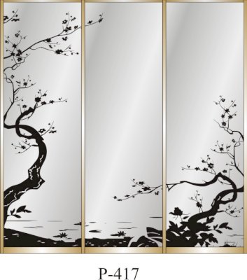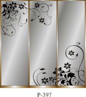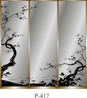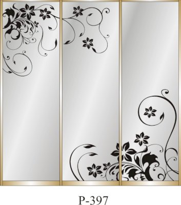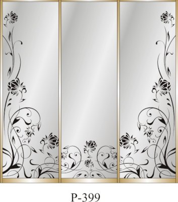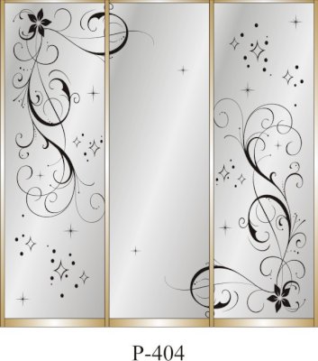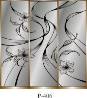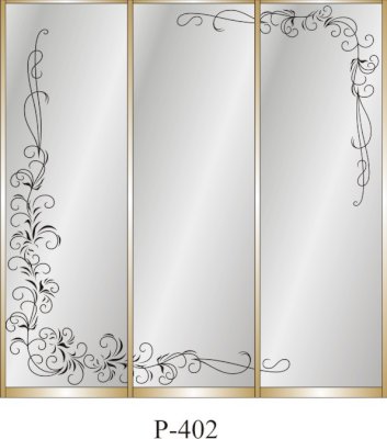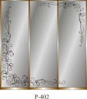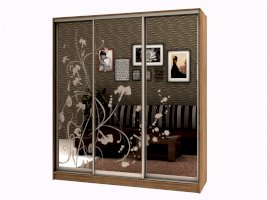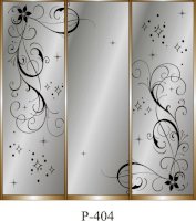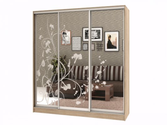 корпус - Дуб Сонома, фасады - зеркало с пескоструйным рисунком, рамка двери и треки - Серебро матовое.